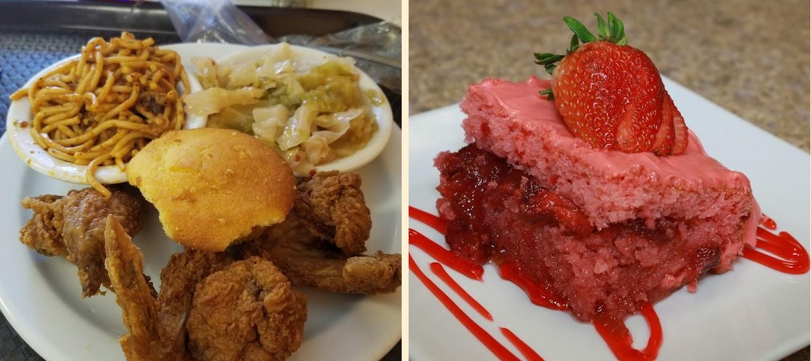 Do not miss the buttery fried chicken and baked chicken. Meatloaf and smothered chicken also hold a special place on the menu. Treat yourself to desserts like butter roll and cake slices.